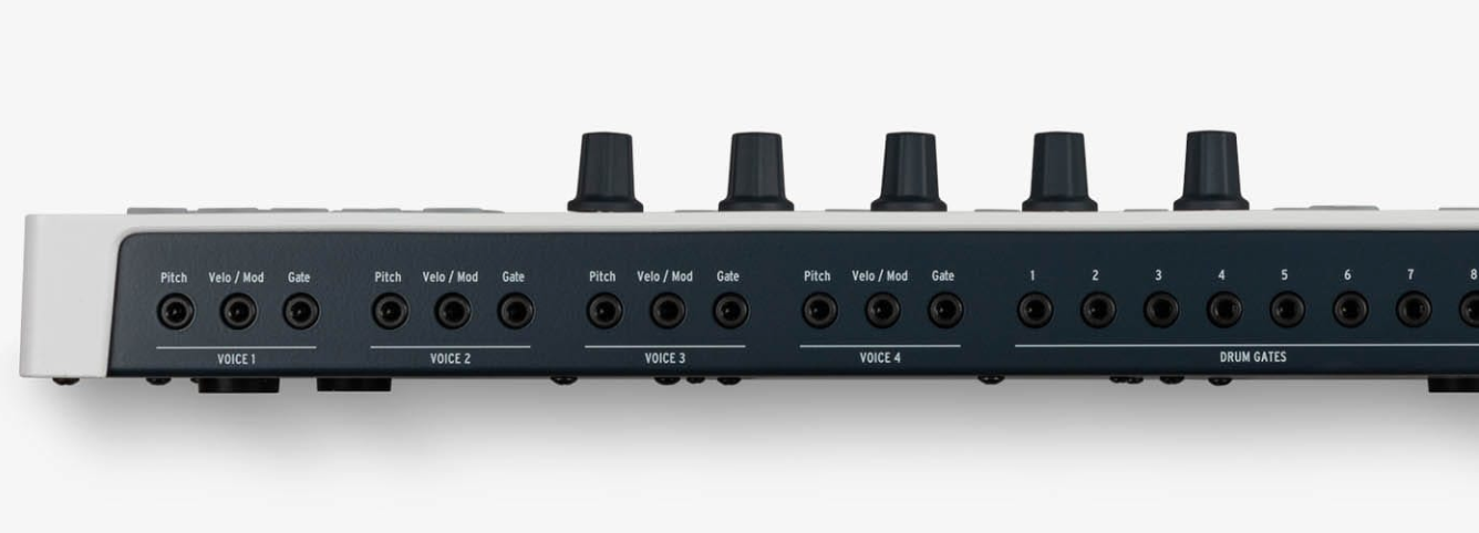 4 CV/Gate/Mod outputs, 8 drum gate outputs, 1 MIDI in, 2 MIDI out, USB, Clock synchronization, Metronome with line output, and sustain pedal input.