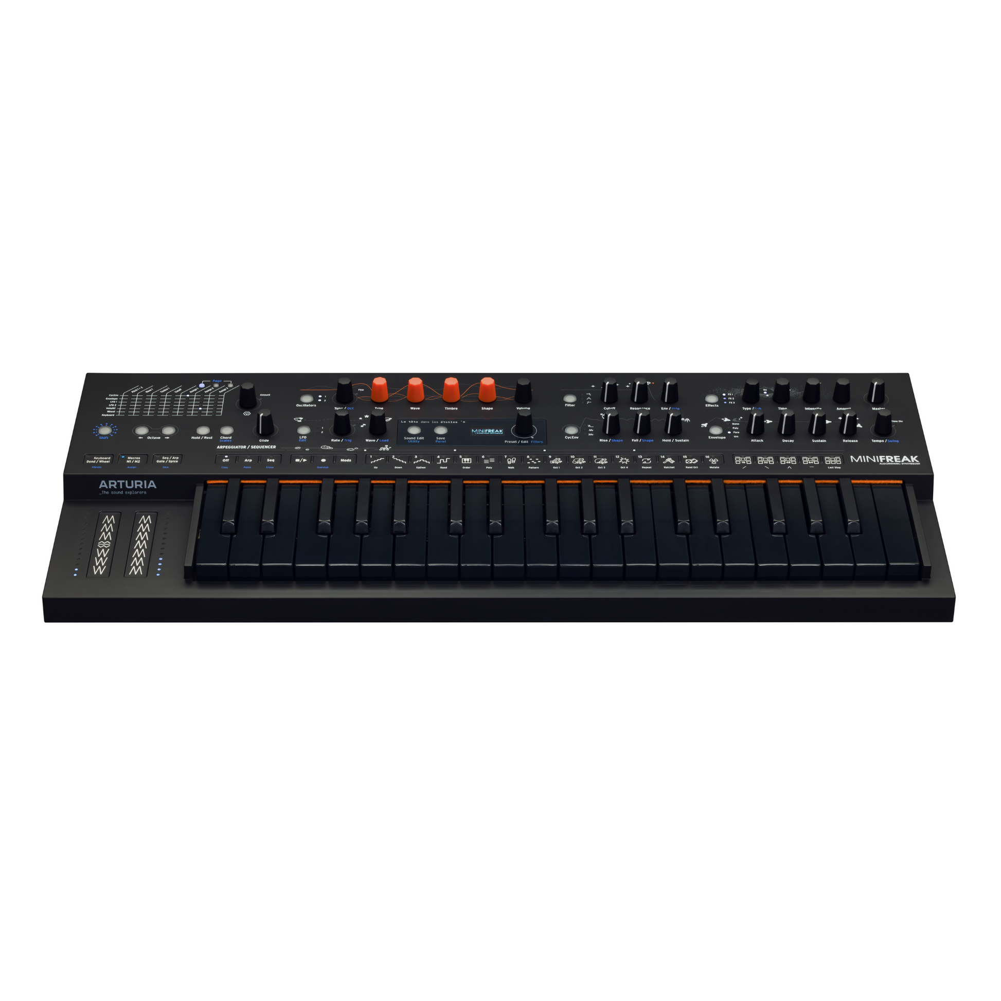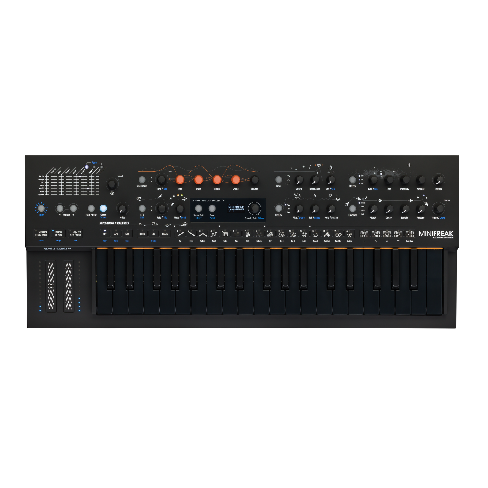 MiniFreak Stellar is a special edition of the mighty polyphonic hybrid keyboard. The same dual digital sound engines, gnarly analog filters, advanced modulation, sequencing and stereo effects, but with a dark intergalactic edge that will take your sound into deep space and beyond.