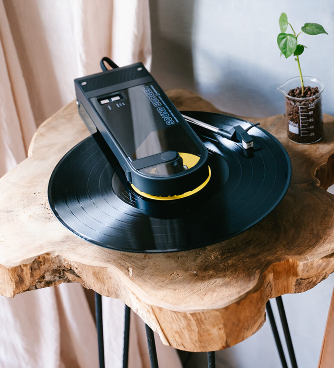The Sound Burger offers high-quality sound reproduction with a belt-drive system that plays 33-1/3 and 45 RPM records. To achieve both portability and stability, the tonearm employs a dynamic balance system in which stylus pressure is applied via a spring. In addition, a high-precision DC motor maintains stable rotation.