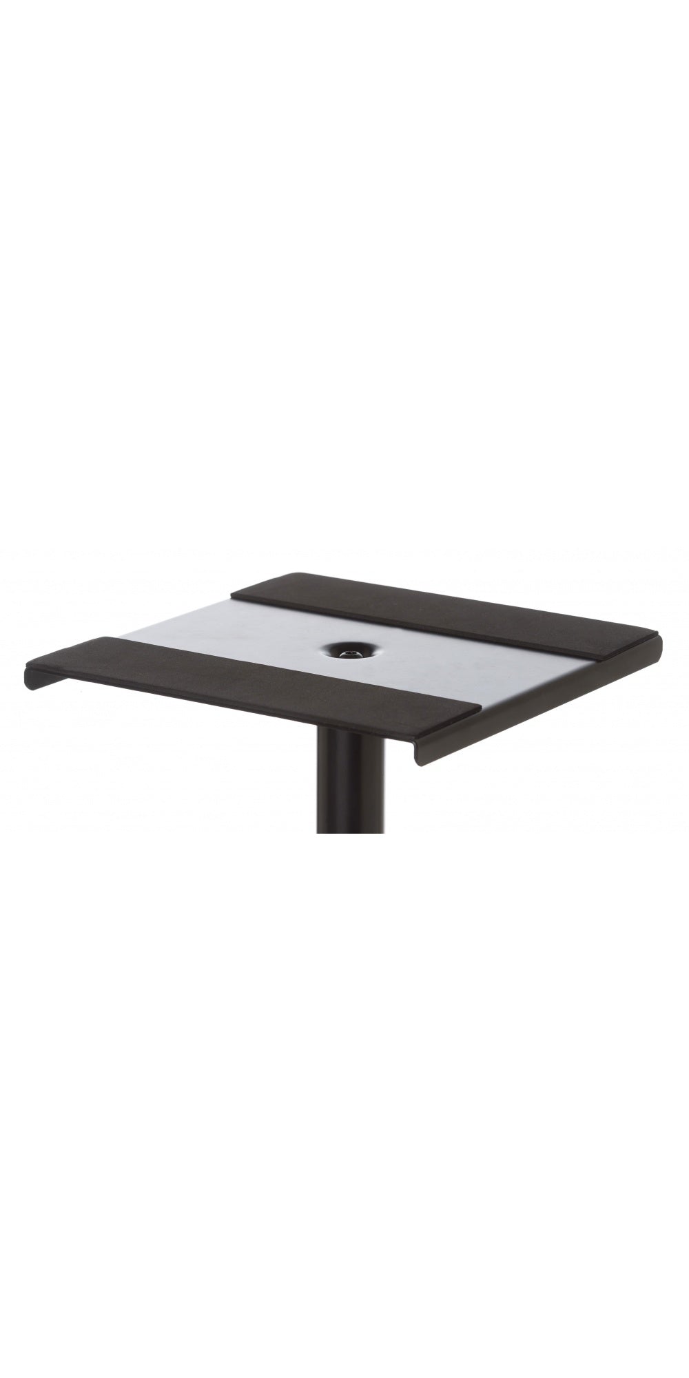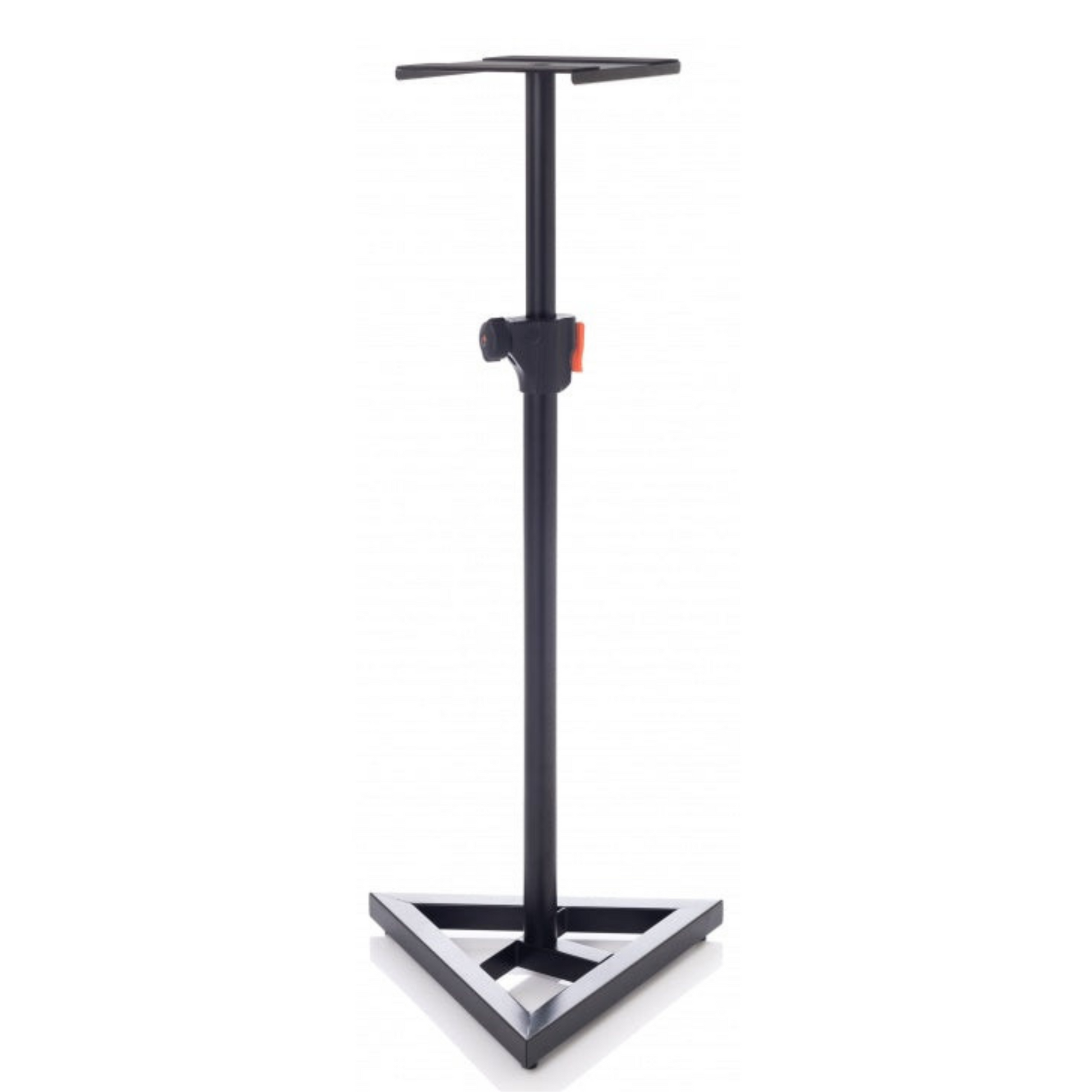 Professional steel monitor and speaker stand. 23×23 cm support shelf with non-slip rubber protection. Height adjustment system with automatic button and safety knob. Triangular base with a range of interchangeable feet for different types of flooring.