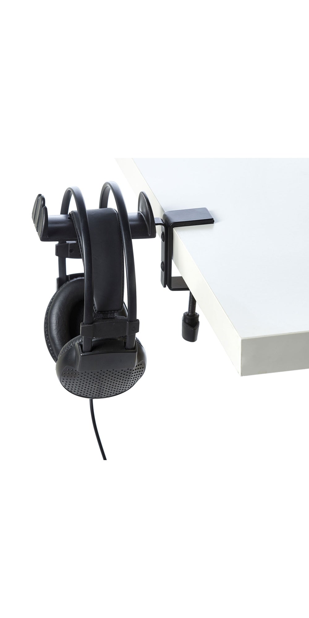Headphone stand with table hook. Made of loaded nylon. Adjustable table hook up to 45 mm.